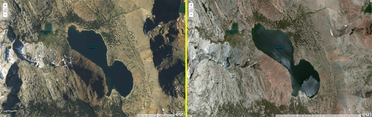 The area shown below is near Yosemite National Park, and highlights the fact Clarity is of benefit in non-urban areas as well. The World Imagery on the left is more recent, but has long shadows hiding some of the details. World Imagery Clarity on the right eliminates the shadows, providing more detail.
