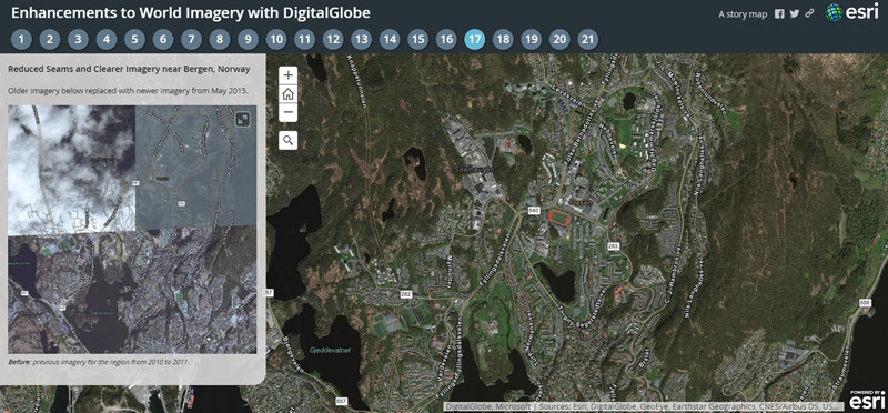 This is the latest in a series of updates to our World Imagery basemap with imagery provided by DigitalGlobe, expanding on earlier updates in the last few months of 2016. This is the latest update with Basemap +Vivid imagery, which is now available at 1m resolution (down to Level 17) for the area shown above. The Basemap +Vivid imagery significantly improves upon the image currency and quality in these countries, as you can see for a few sample areas (tabs 17, 18, 19, 20, and 21) in the story map below.