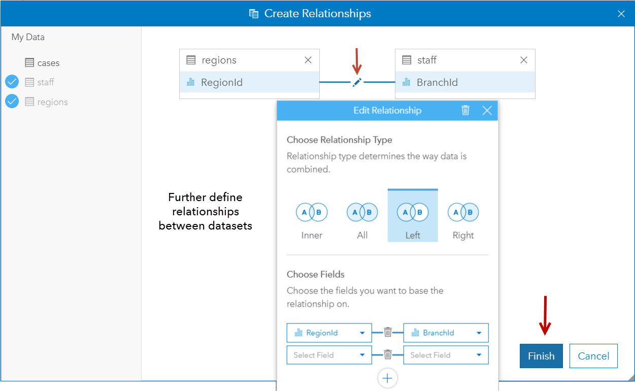 Above I’ve dragged out the datasets I want to join together, which are regions and staff. If I am happy with the smart defaults Insights chose for me, I can click finish and I will be done! Alternatively, I can use the pencil to define the relationship further.