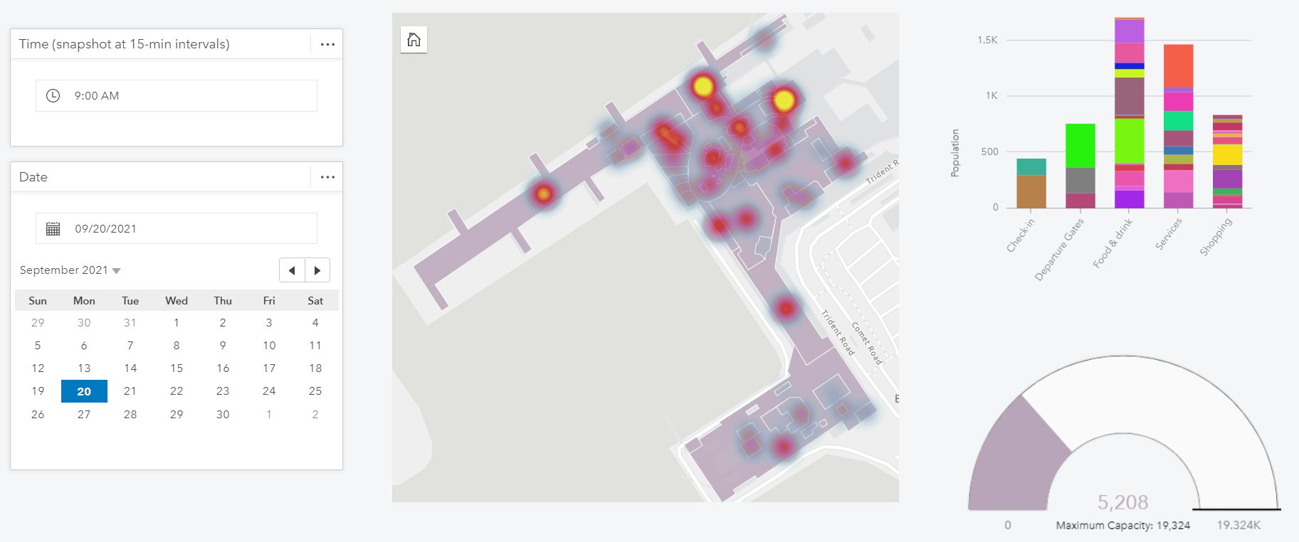 In the below example, we can understand how airport foot traffic varies throughout a day, by selecting the day and time. Explore this example live here.