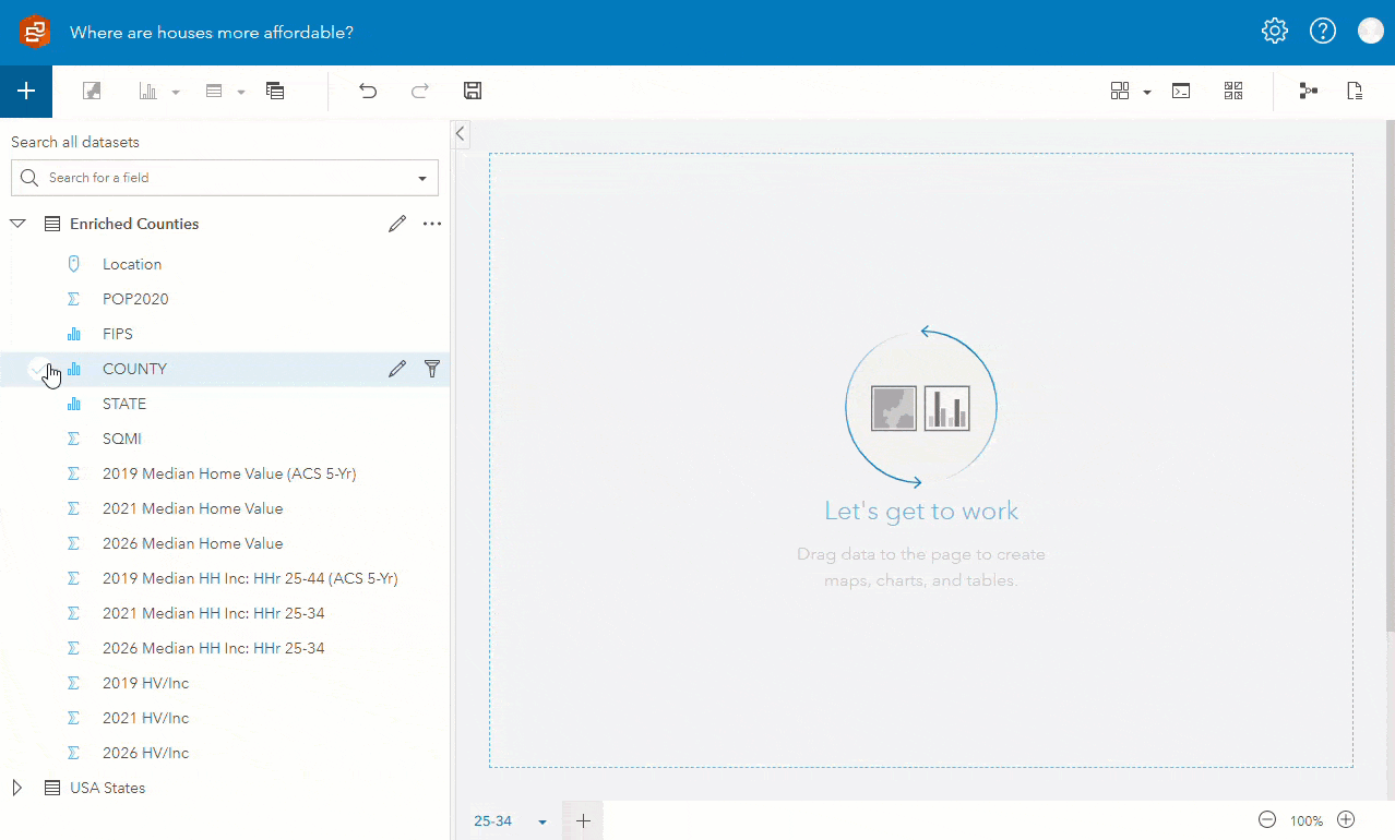 I started looking for datasets I could use when a colleague pointed out I had everything I need right in Esri’s data catalogue and can access that data right in Insights. I started with a USA county layer retrieved from Esri’s available boundary data and then made use of Enrich Data. Enriching the counties with details on Median Home Value and Median Household Income for ages 25-34 in 2019, 2021, and 2026.