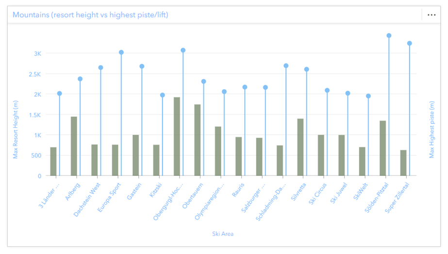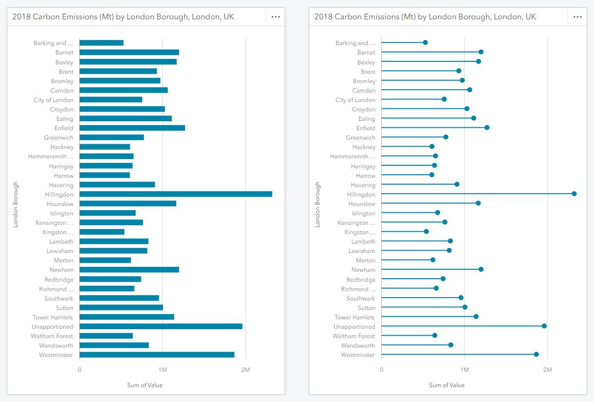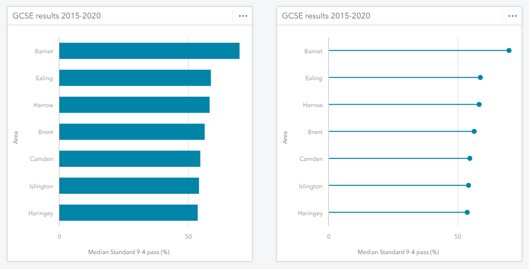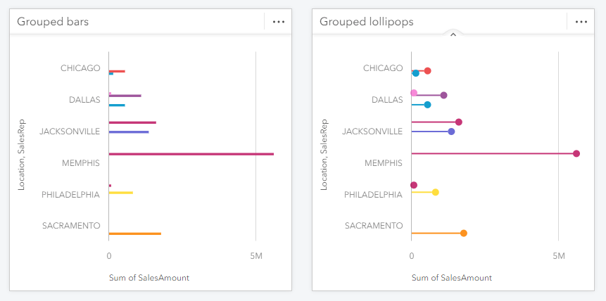 Grouped bar or column charts can sometimes be slightly harder than normal to read due to the data, e.g. the spread of values or there being inconsistent sub-categories between groups, or if the card size is small. In many of these cases the lollipop style can help.