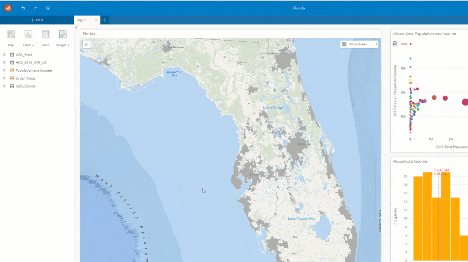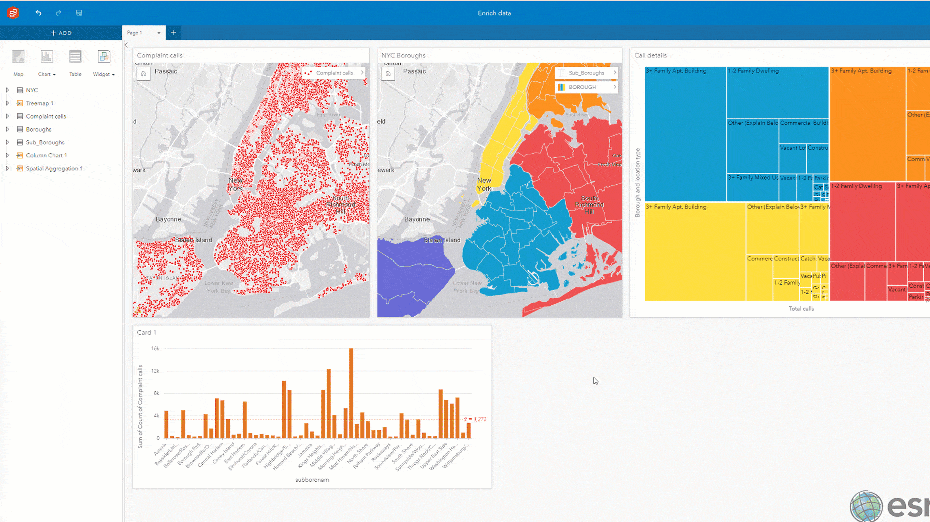 Once your data is location-enabled, you can enrich that data with Census data or demographic, psychographic, environmental, and economic variables that comes with Insights. Easily combine over 8,000 US variables and hundreds of international variables to your data, then use that for further analysis and more insights. Updated regularly, Esri Demographics datasets are of high value with strong lineage, accuracy, and completeness, and they are all included with Insights.