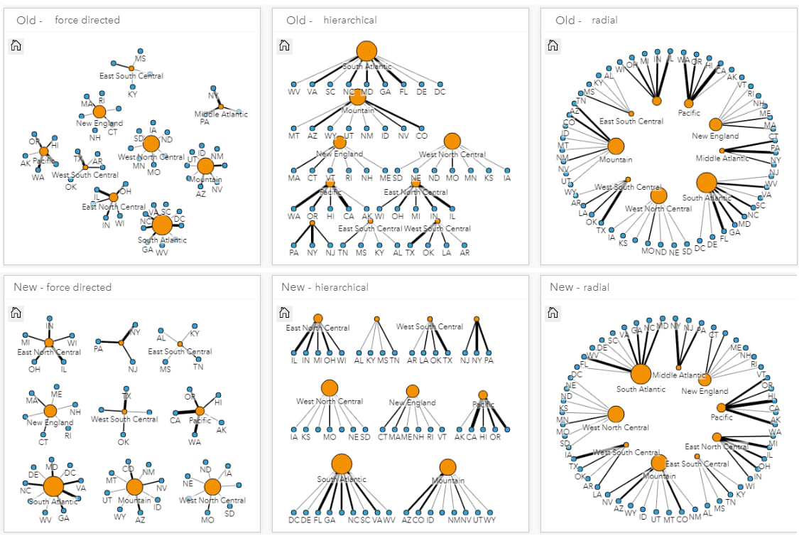 Link analysis (also commonly called graph analysis) allows you to understand relationships and connections within your data. This can be either a link chart (non-spatial) or a link map (spatial). ArcGIS Insights now has improved link chart layouts and better use of space, for a cleaner layout appearance.