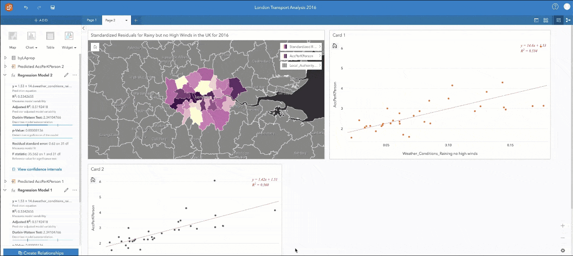 Regression analysis is an extremely powerful way to model relationships, and make predictions. We’ve added more statistical outputs to ArcGIS Insights so you can be confident in whether your model is accurate or not. These new outputs (F statistic, t-value, p-values, and confidence intervals) allow you to more easily perform confirmatory analysis. This basically means that you can quickly understand how the model performs and if it is trustworthy. The process of creating a great regression model is repetitive and iterative. It’s easier to compare two model results against each other, run an additional model, and continue the comparisons until you’ve identified a solid model. During each comparison, you can see how the explanatory variables compare against each other, against the other model, and what predictors align with each variable.