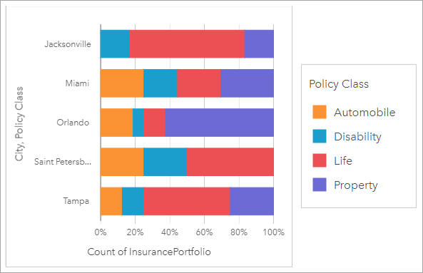 In the below example, the percentage of each insurance type (life, auto, etc.) is shown within each regional territory.