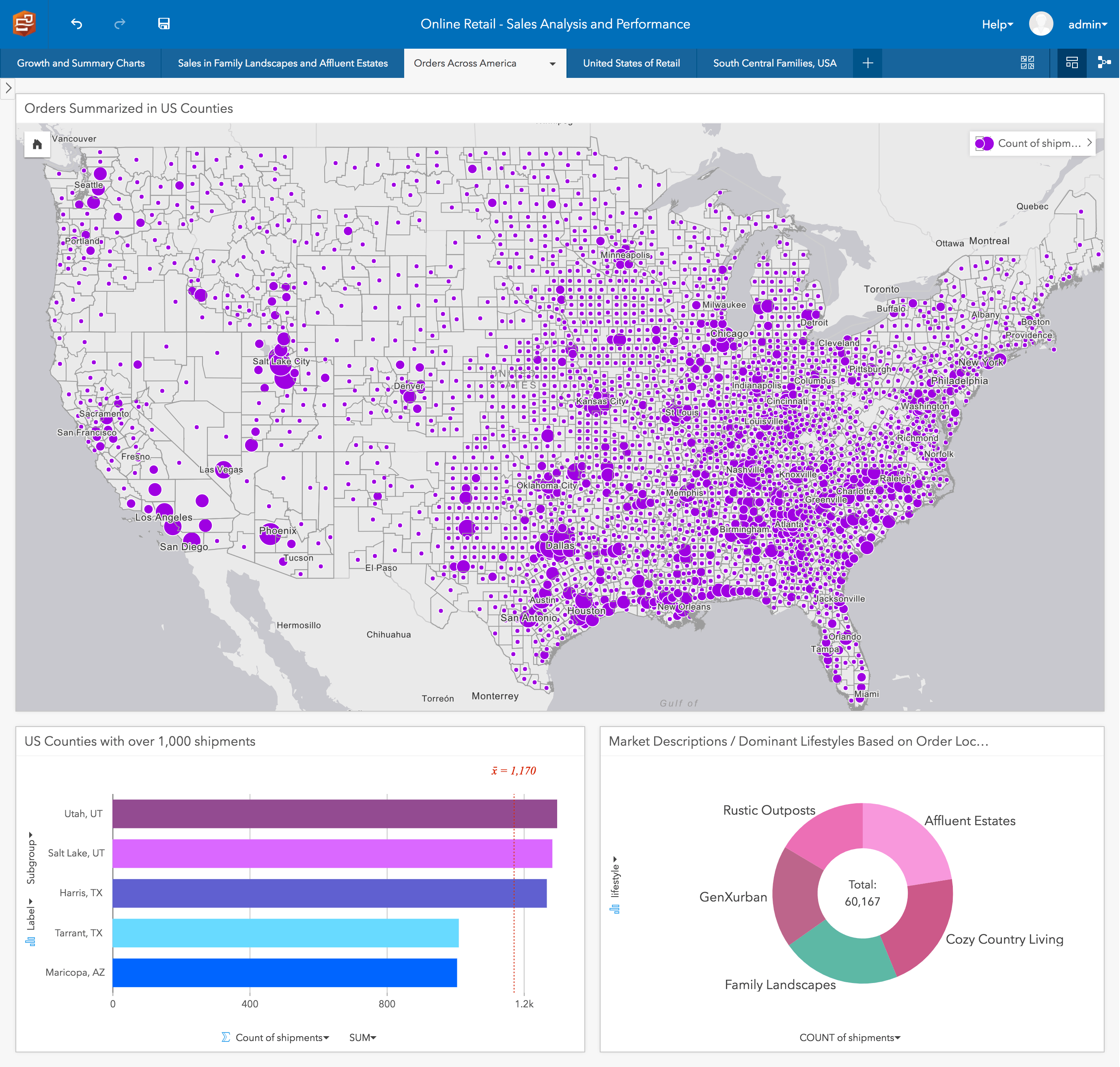 In the map above, I aggregated the number of customer orders within each county using spatial aggregation. Instead of showing the total number of orders, I could have shown average sale amount or total sale amount within each county. Additionally, I could have symbolized my map using a variety of different colors and styles.
