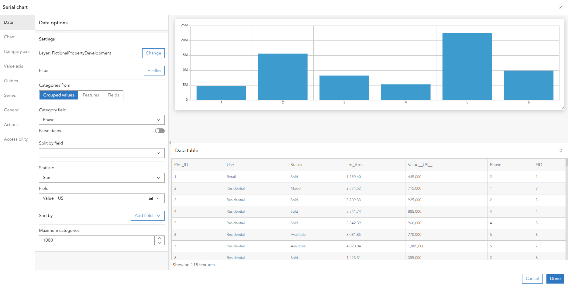 If I choose Phase as my category field, and for statistic choose Sum with the Field of Value (US$), then I end up with a preview of a column chart.
