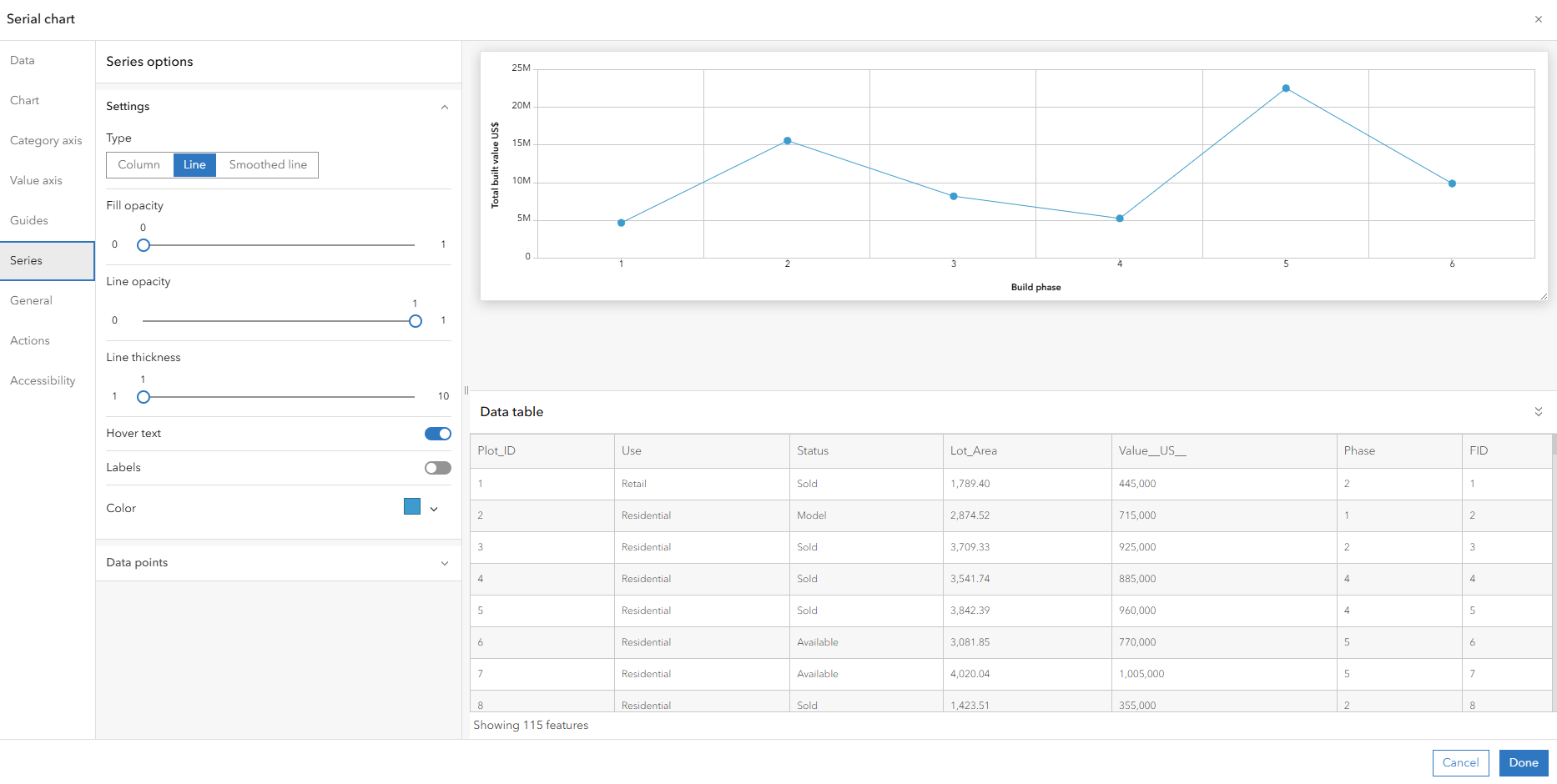 Just like the map, I am then prompted to choose a host of settings. Let’s take an example of a line graph of build phase versus total built value in dollars.