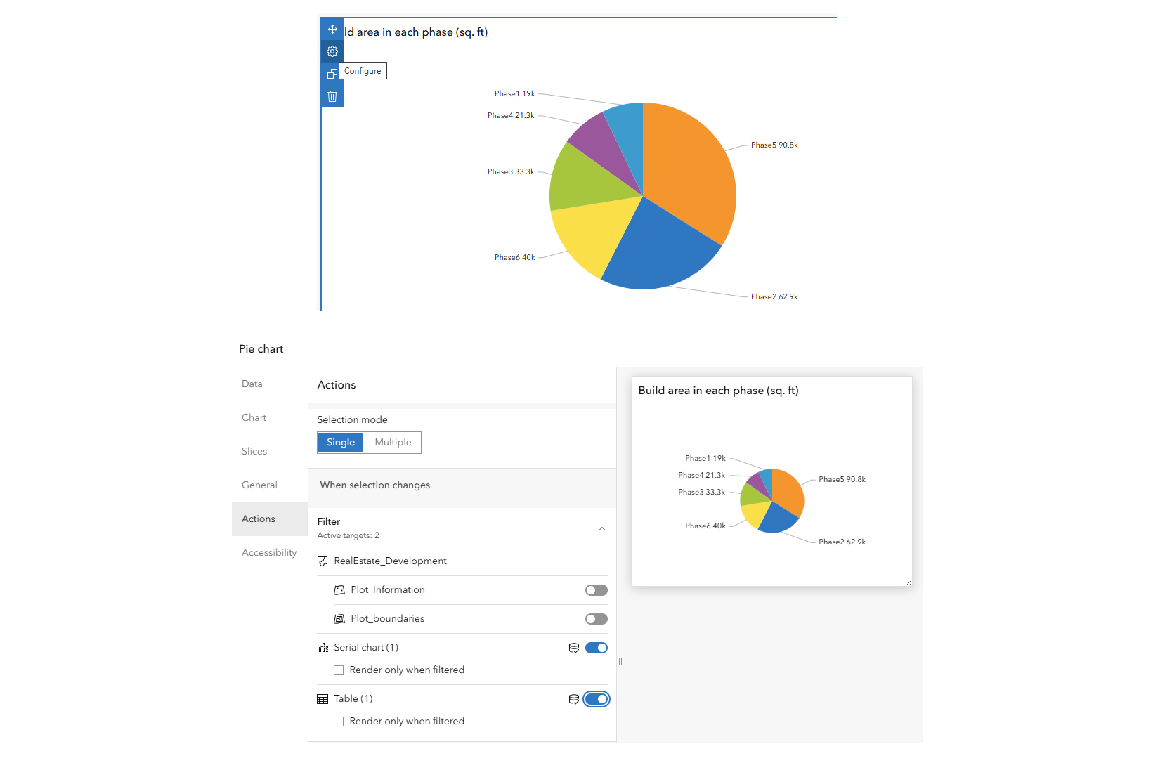 In my example, I’m going to hover over my pie chart element, find the ellipses (…) and click on Configure and then on the dialog that appears, choose Actions, and expand the Filter dropdown.