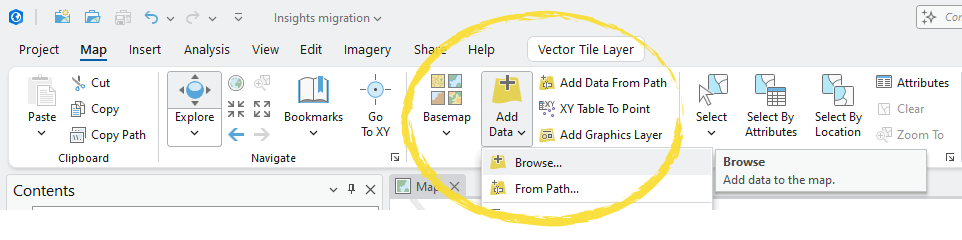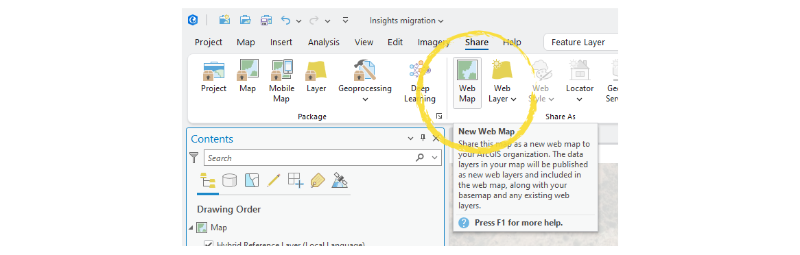 To add a map to Dashboards, it must be saved as a web map in your portal. To recreate an Insights-like map, load the same data layers into either ArcGIS Pro or Map Viewer. Both processes are very similar, as described below.