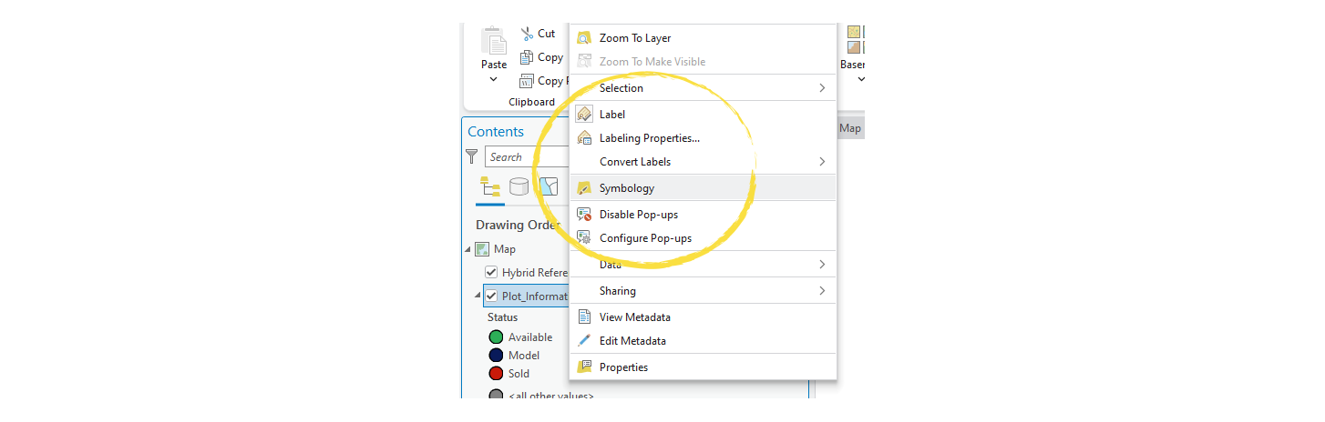 Import your dataset(s) and join any data you want the “map card” to be able to control. From the Contents pane on the side of the screen, right-click a layer to access set up for symbology, labels, pop-ups, and more.