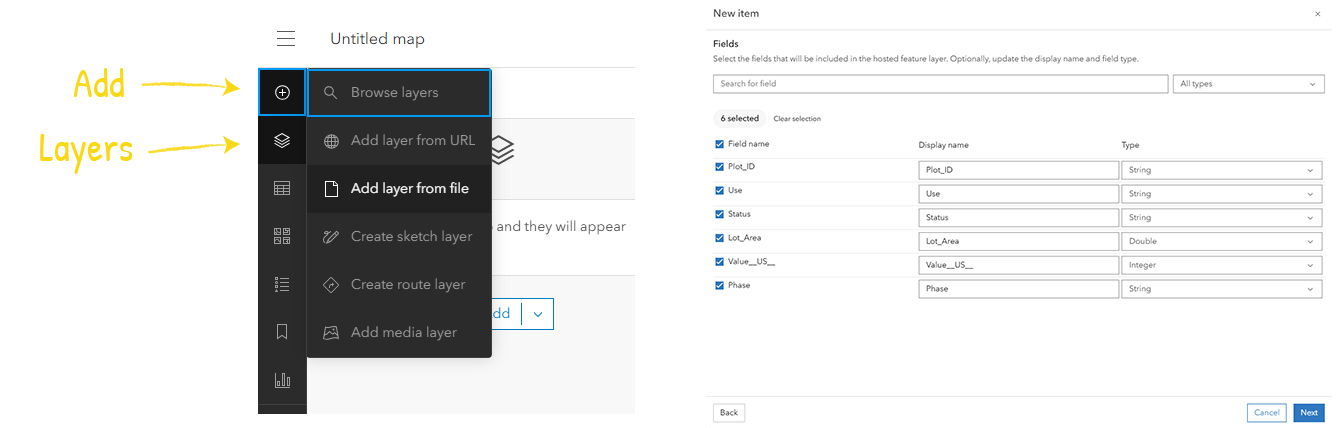 Alternatively, by clicking on the Add (+) tab and Add layer from file, you can add data from a standalone file, a cloud sharing service, or a zipped file geodatabase – for which you will need to choose Create a hosted feature layer and add it to the map, confirm or update the fields types for the layer and, once you click Create and add to map, it will become hosted in your portal and added to the dashboard.