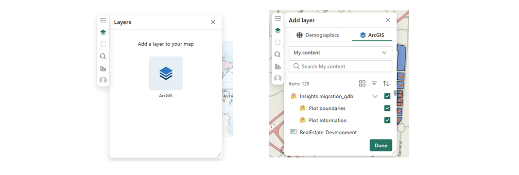 In my example, I clicked on Layers, then ArcGIS, expanded my hosted file geodatabase, and checked the boxes for both my plot boundaries (polygons) and plot information (points) in the order I wanted them to draw, and clicked Done.