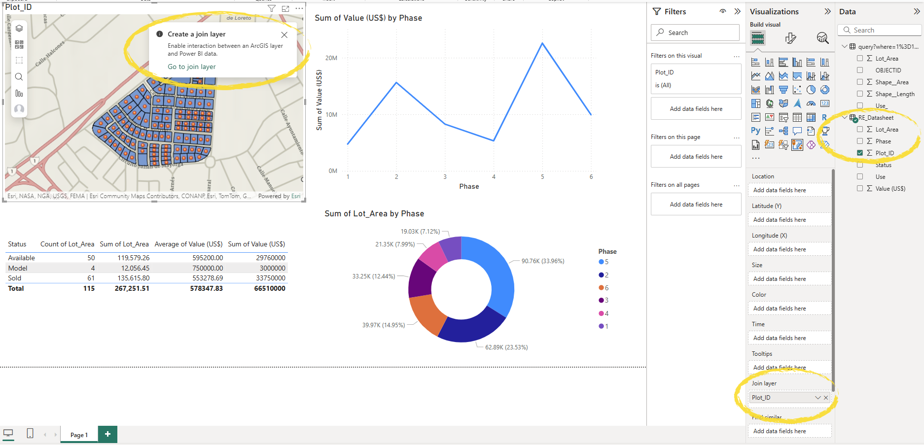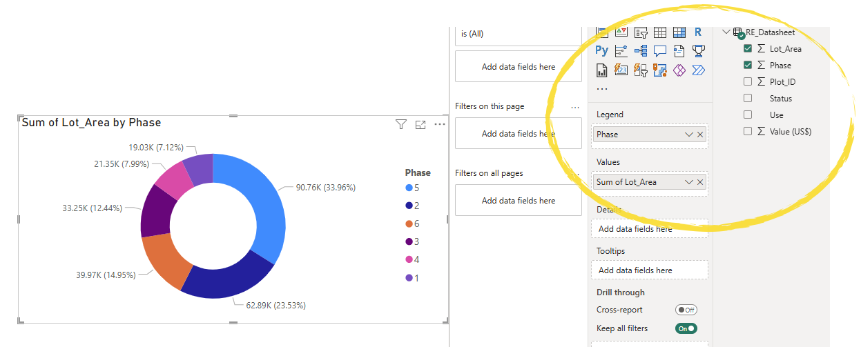 For the donut or pie chart, I drag Phase to the Legend field – this is the field that will determine each segment category. Then I drag Lot Area (sum) for the values to give me the total development area for each phase.