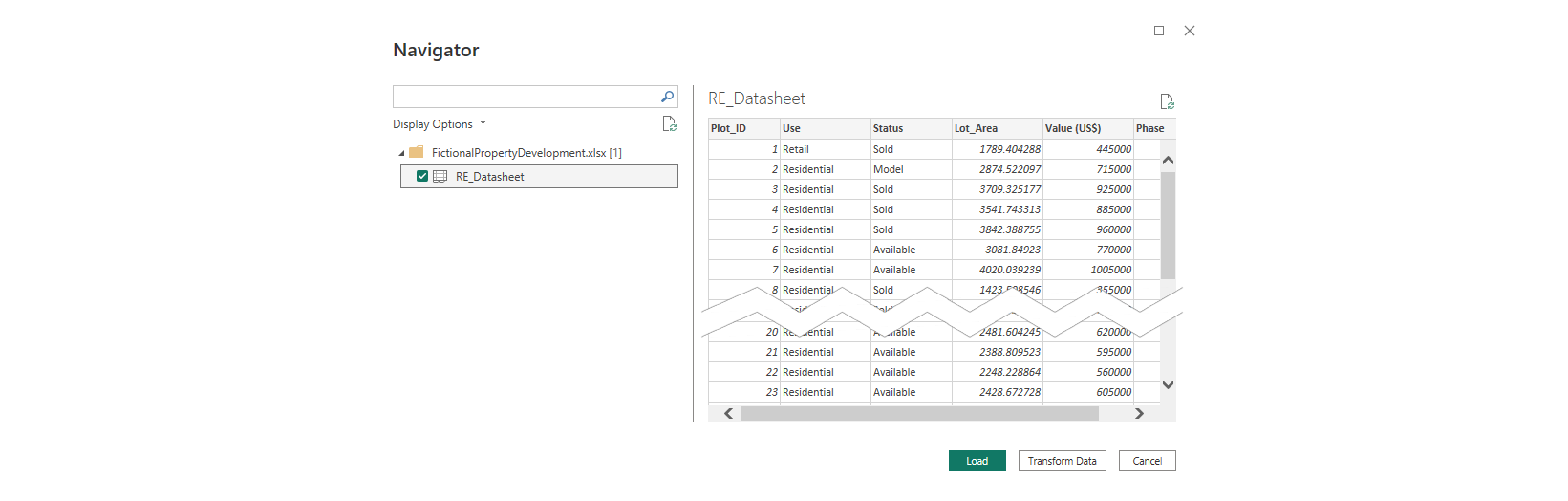 Doing so brings up the Navigator dialog where, in my example, I choose the sheet from Excel I wish to use, and then I usually choose Transform Data which opens the table in Power Query Editor allowing me to check the field types, etc. are how I want them.