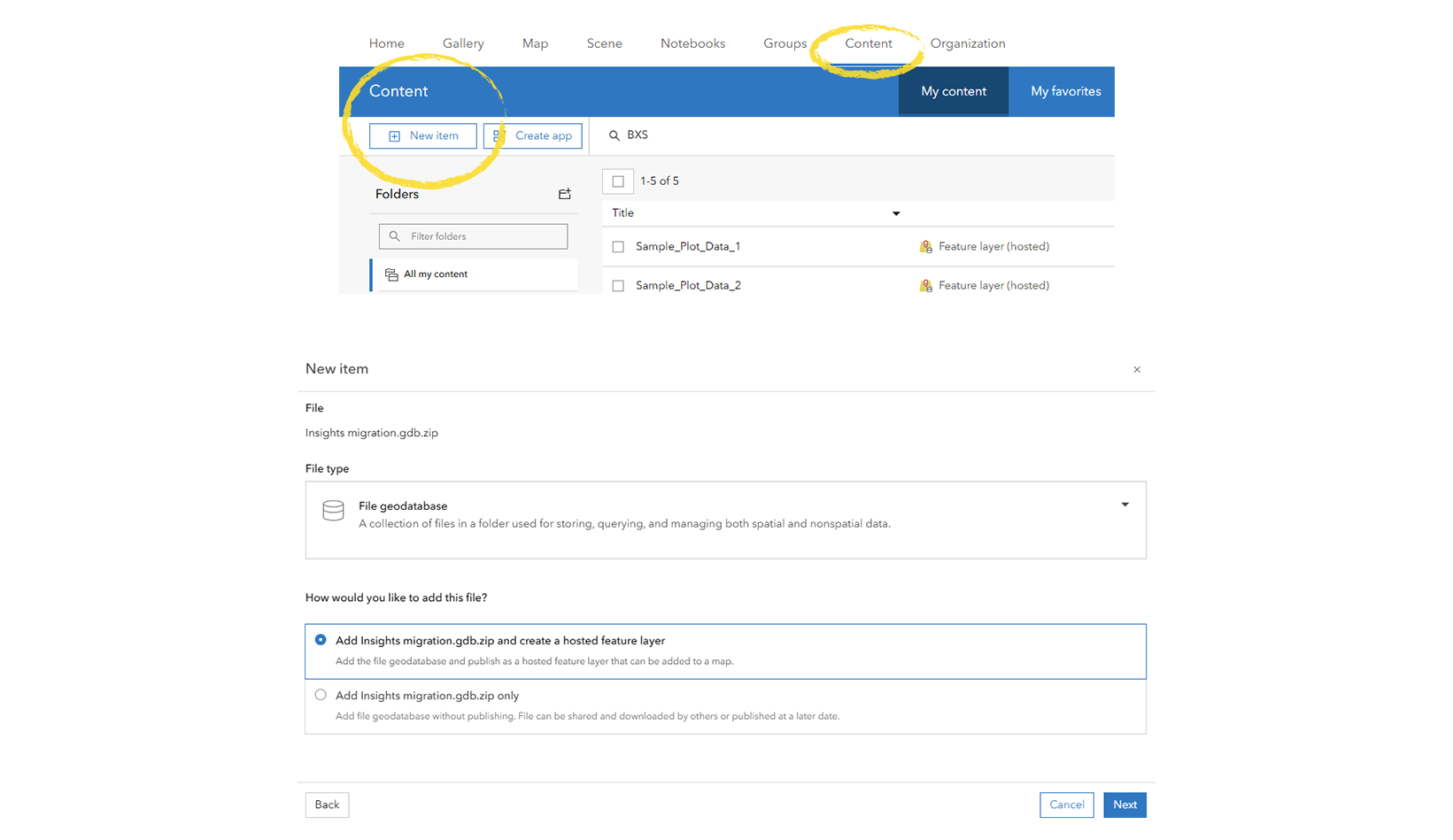 If your spatial layers are in an Esri format then you’re going to want them to be hosted on your portal. Open your ArcGIS Online or ArcGIS Enterprise portal in a web browser and go to the Content ribbon and click on New item.