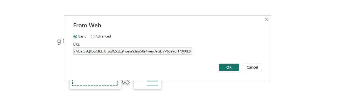 Return to Power BI and from the Home ribbon, click on Get data, and choose Web. In the URL box, enter the full string from Notepad.