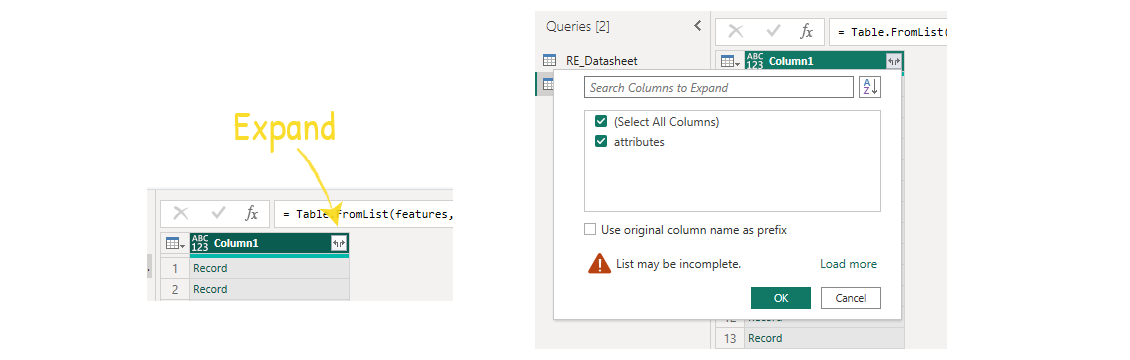 Next, click on the Expand button to the right of the Column1 fieldname and uncheck Use original column name as prefix, click on Load more to remove the warning, then select OK.