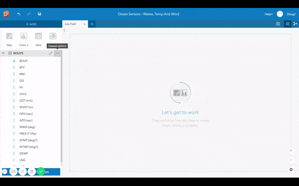 Insights enables filtering from the data pane. There are various types of filters included with Insights (such as card filters and cross filters). When filtering data from the data pane (using the filter icon) – every map, chart and table will include that filter. Since the National Data Bouy Center denotes missing data using numerals 99 and 999, I had to filter these out.