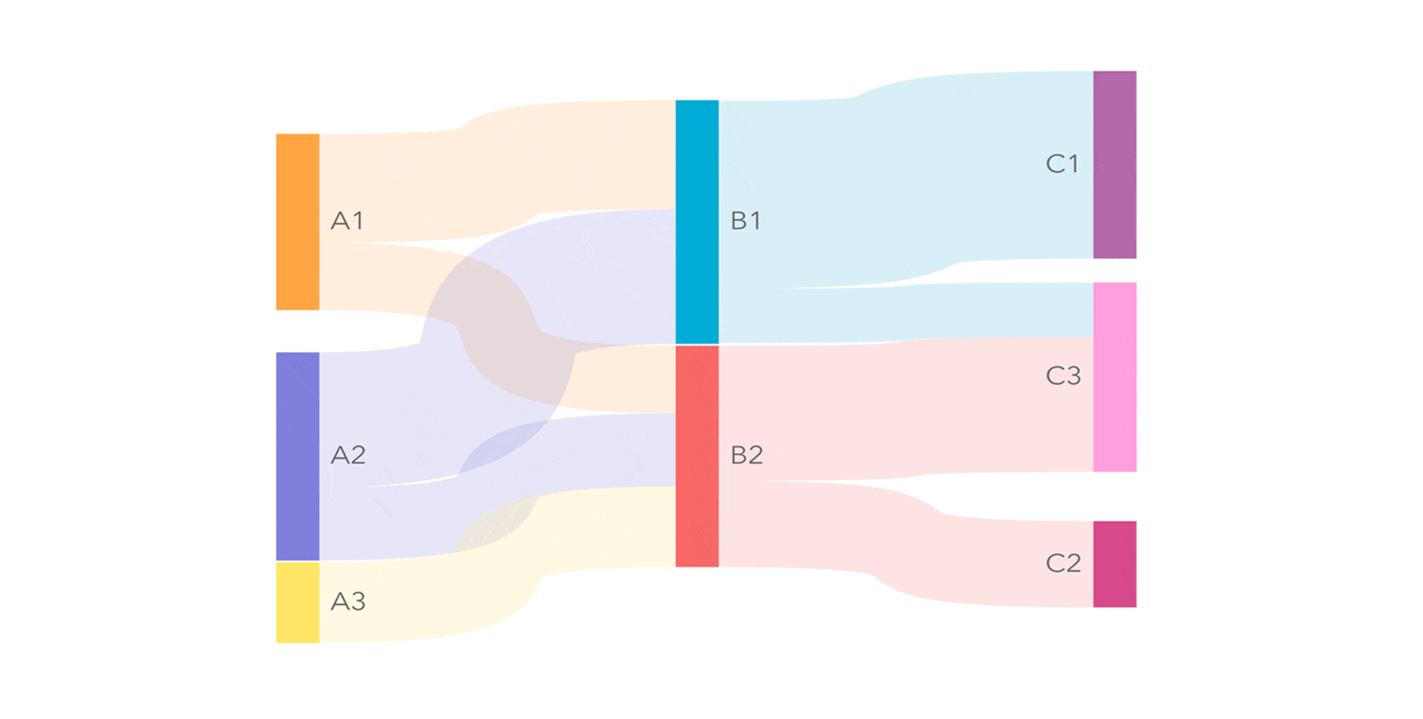 Use alluvial diagrams to show many-to-many mapping between groupings, identify relative strength of links, or trace multiple paths through a hierarchy.