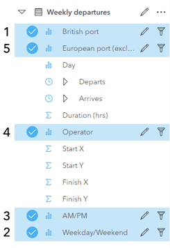 Fields will be displayed on the chart as columns in the order in which you select them in the data pane. The order of everything else is calculated by the chart tool to limit path crossing and optimize legibility.