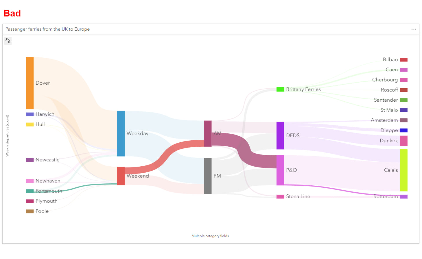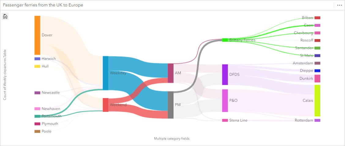 In this example, we have weekly passenger ferry crossings from the UK to mainland Europe broken down into a flow of which port they set sail from, the day of week, the time of day, the service operator, and the port to which they arrive.