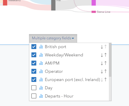 Notice how important the order of the fields is to the information portrayed in the chart. Without interacting with the chart, we cannot trace or link a British Port with an Operator because we have chosen to group the links by time of week before the flows reach the Operator column.