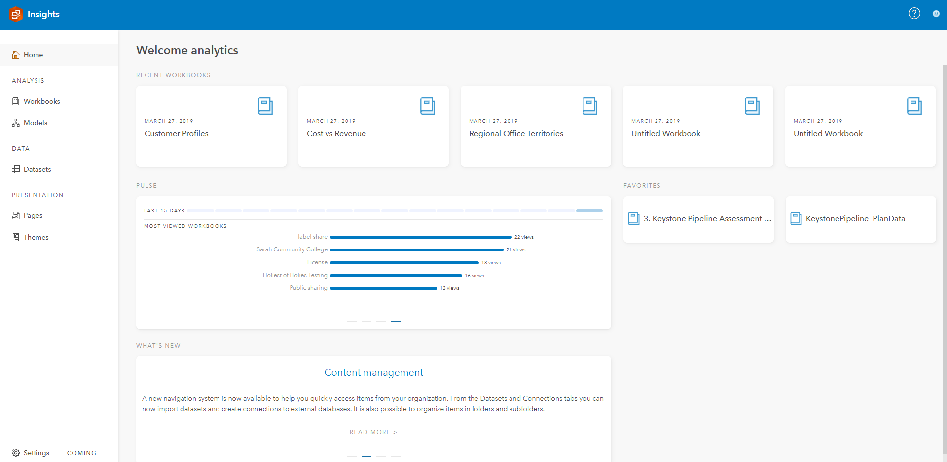 The Insights home page has been enhanced so that you can work faster and easier, without going into your Portal for content management tasks. As soon as you log into Insights, see your recent workbooks, favorites, and most used items. On the left of the home screen a new content navigation layout organizes your analysis, data, and presentations for easy access. Even create folders and subfolders. Search items as well. …and now you can directly add shapefile, geodatabase, and GeoJSON datasets.