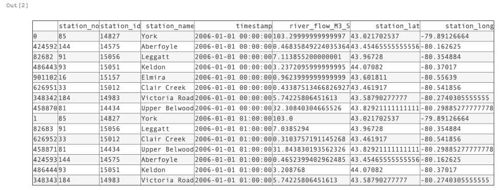 I started with gathering the data from Grand River Conservation Authority, my local conservation authority. I was interested in river flow again but many other variables are available from their monitoring datasets. This specific download interface limits the downloads to a 365-day range. However, I was looking to explore the data across a greater date range, I resigned to performing a number of downloads for the stations of interest.