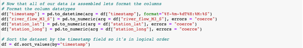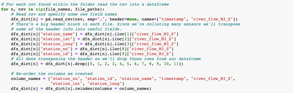 For each of the files collected from my data directory, I’d read those *.csv files into a pandas dataframe. I also transposed some of the attributes from the file header into new fields by referencing their row index within the second column. When complete I dropped these initial rows from the file. Now that my header was removed and I had my new columns, I organized the fields in the file.