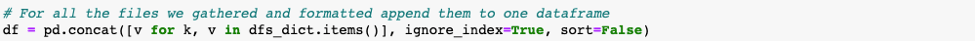 I concatenated all of the dataframes from the dictionary that was constructed. Moving forward, I’d have a single dataframe to work with in the script.