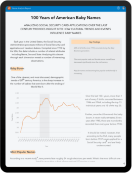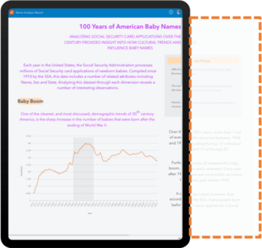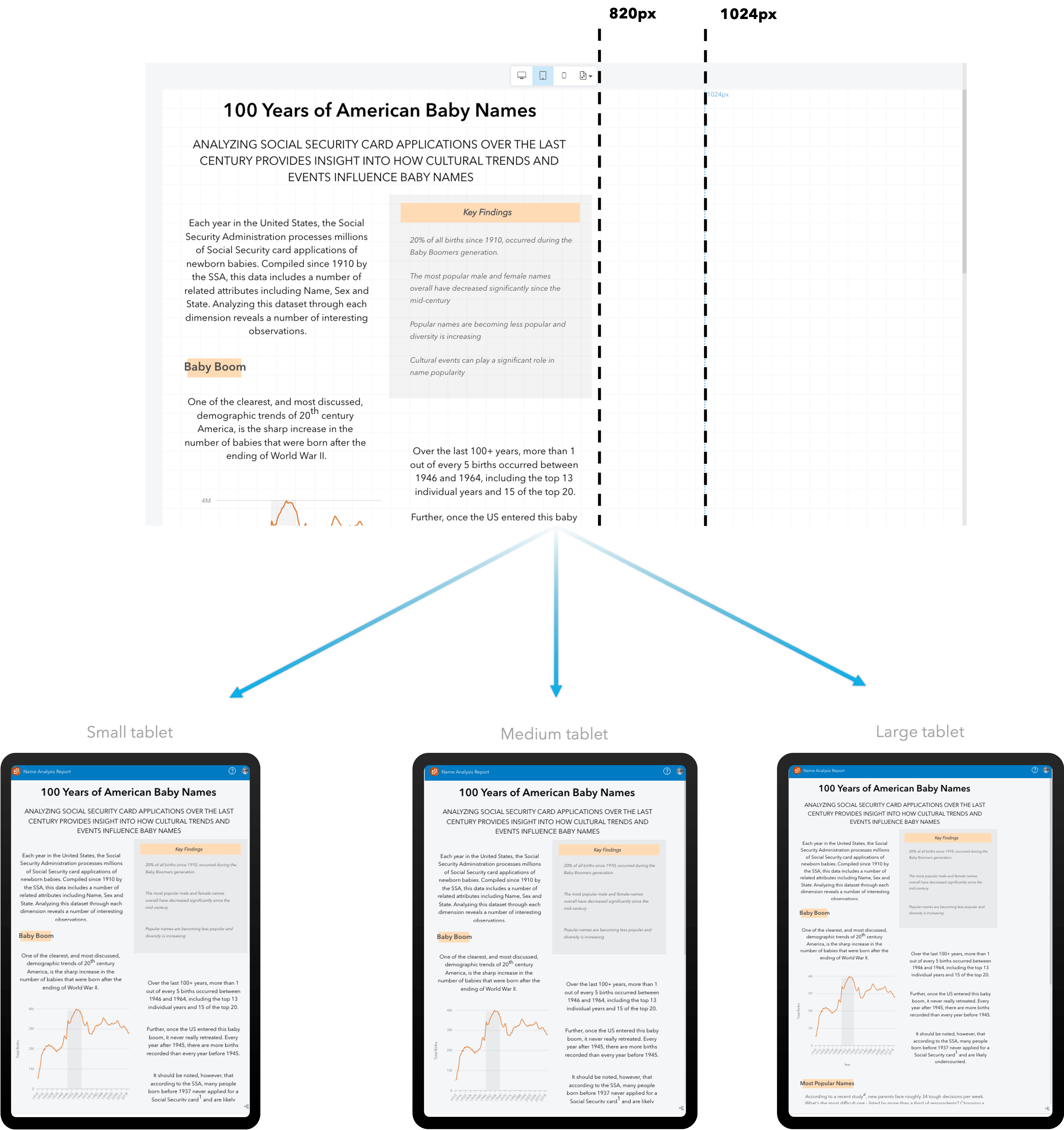Let’s dive into a specific example. In ArcGIS Insights, I’ve completed an analysis of 100 plus years of baby names using United States Social Security. My goal is to create an executive summary report that highlights notable trends and interesting patterns. I believe this content is best consumed on a desktop, but I also realize that the report is going to be shared publicly, so it should work across all device categories.
