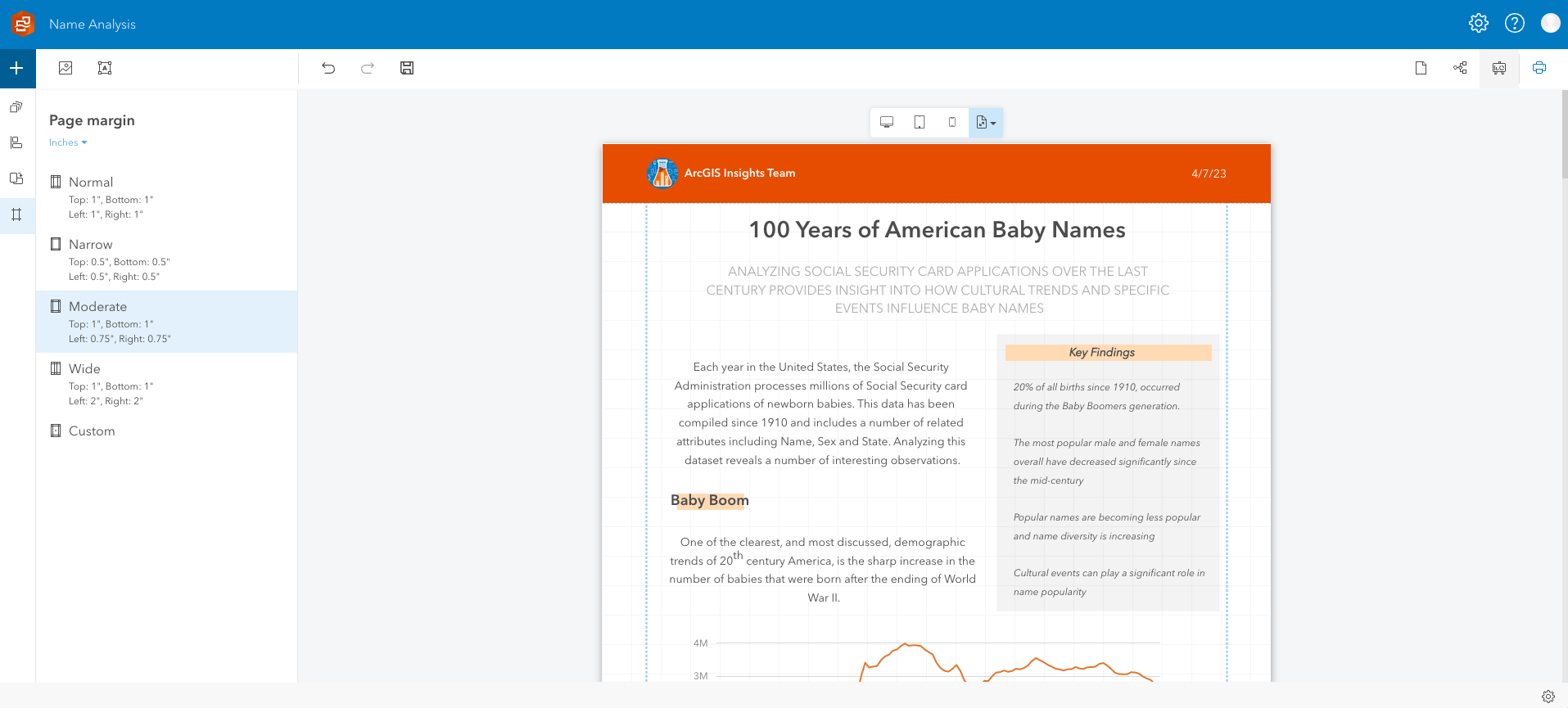 - Interactive reports: The report designer uses a framework commonly known as adaptive web design. Report creators design layouts for one or more device types and the published report serves up the appropriate layout based on the device of the viewer. This framework provides the greatest amount of user flexibility while maintaining ArcGIS Insights as a powerful tool for analysts of all skill levels.