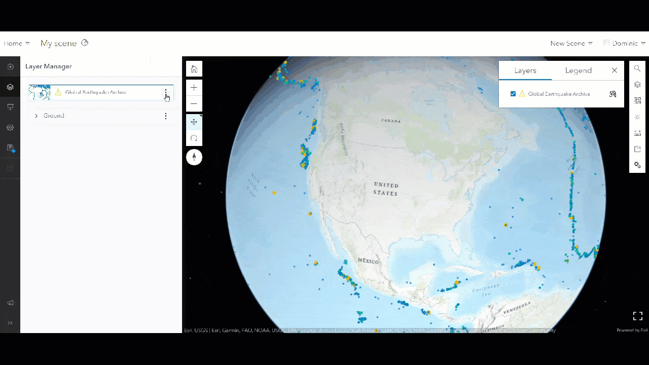The easiest way to enable time in the 3D Viewer app is to start with a 2D time-enabled feature layer. For example, you could start with a hosted feature layer showing earthquakes from 1900 to 2022 which is available from the Living Atlas. Despite this being a 2D layer, you can display it directly in Scene Viewer.