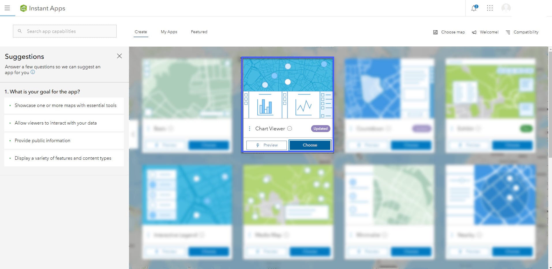 ArcGIS Instant Apps offers a variety of web app templates based on your requirements like Exhibit, Nearby, Chart Viewer etc. In this tutorial we will use the Chart Viewer template to publish our web map and charts together in a web app. Next, select Chart Viewer from the layout options. Give your app a title and hit Create app.
