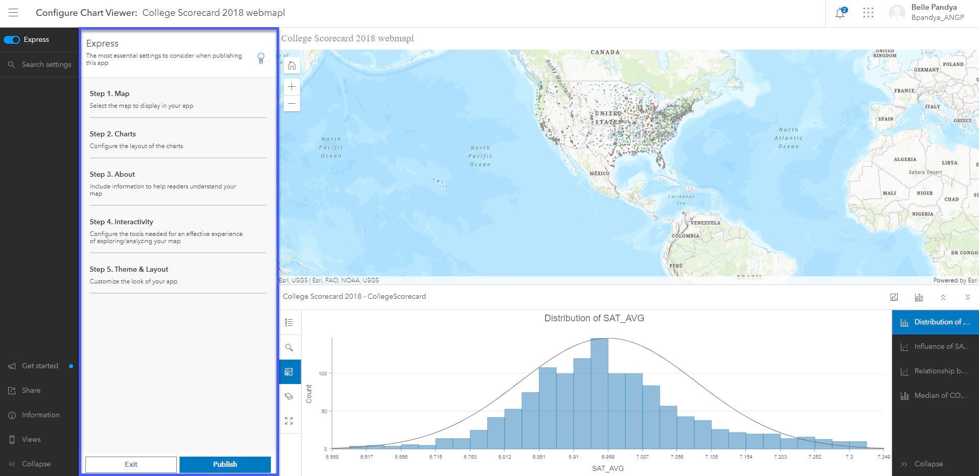 In this tutorial, we will use Chart Viewer from Instant Apps to publish this web app using a web map containing charts created in Map Viewer. Chart Viewer supports all chart types offered in Map Viewer (bar, line, pie, histogram and scatter plot), hence our web map can contain any or all chart types.