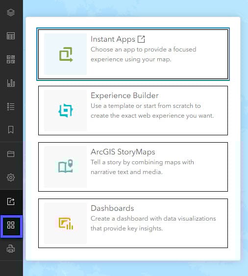 We will need to sign-in into our ArcGIS Online account to access Create App options. We will be using this web map that was created in the previous blog using Map Viewer. You can use your own web map to follow along, just ensure that the web map is saved in Map Viewer and has at least one chart in it. Once you have a web map open in Map Viewer, click on Create app and select Instant Apps from the dark pane.