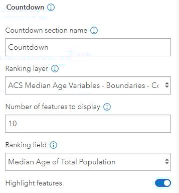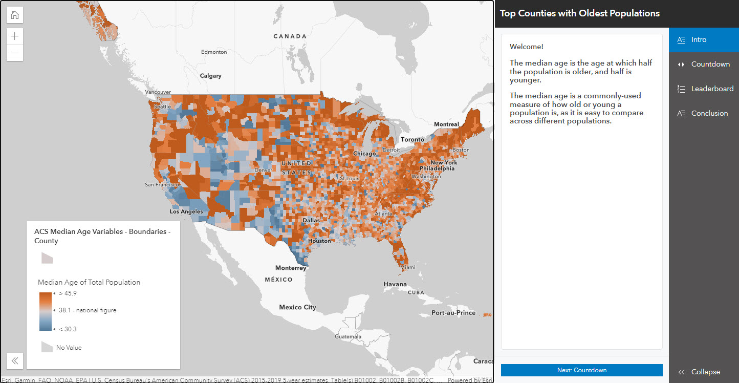 The Countdown section is the bread and butter of this focused Instant App experience. It’s a guided tour of the top (or bottom) features of the map. Sorting is based on the attribute chosen. In this example app, I’ve chosen 10 as the number of features, and I’ve chosen the attribute: Median Age of Total Population. Hence, the app shows the top 10 counties with the highest median age.