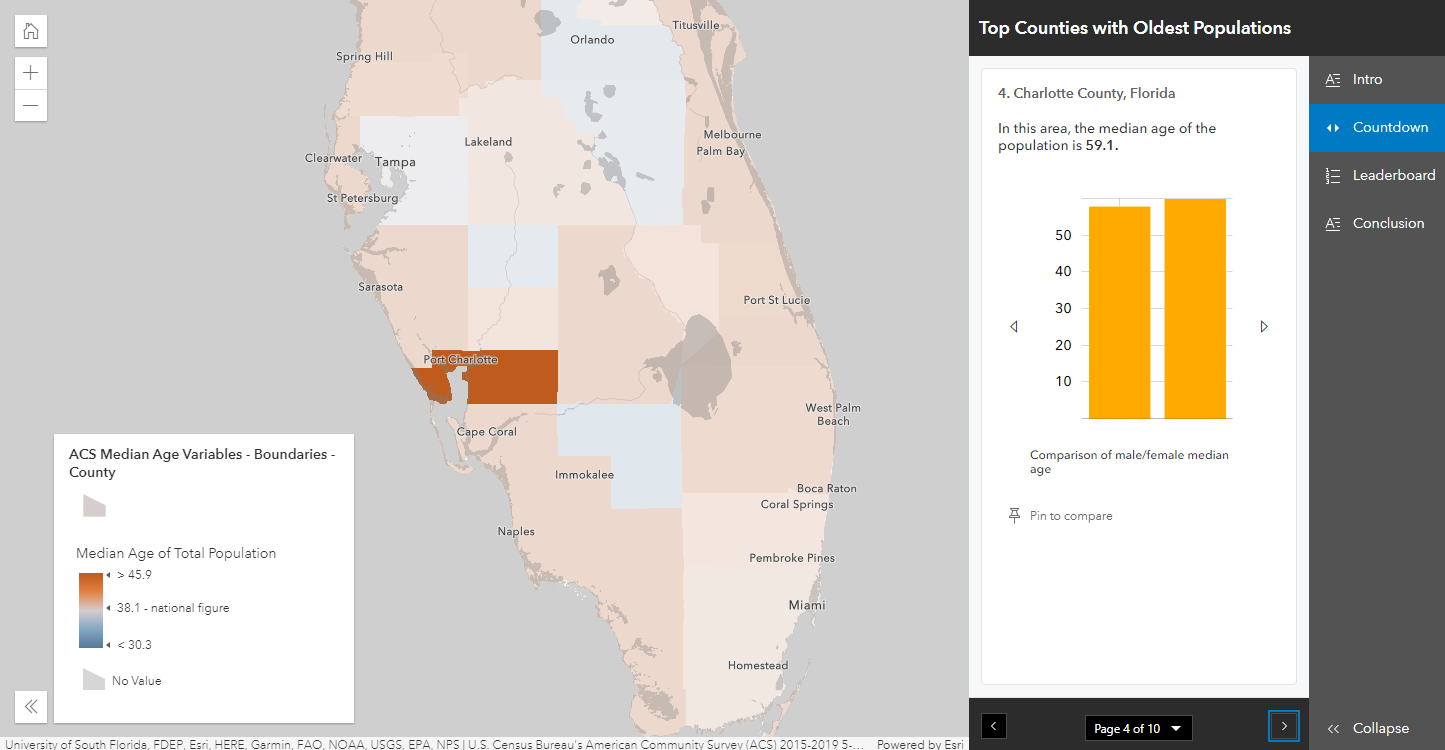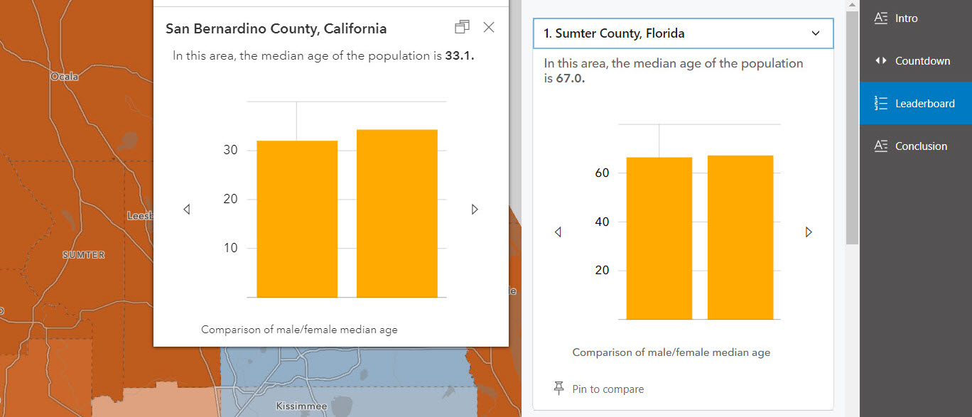 Accompanying the map-based countdown experience is an optional list-based Leaderboard section. The Pin to Compare button allows the app’s viewers to pin a particular feature to compare with others on the list. Up to two pop-ups can be docked for comparison. The leaderboard section does not need to have the same number of features as the countdown. In this example, the leaderboard has a list of the top 15 oldest counties, whereas the countdown goes through the top 10.
