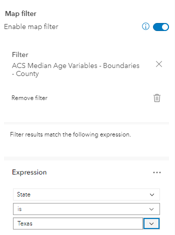 In Step 2 of the Express Setup adding sections, I can apply a Map Filter. For example, here I am filtering a county-level layer such that the attribute called “State” is equal to Texas:
