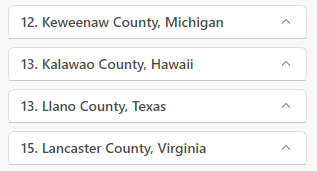 With more features listed, the higher potential for ties in the data to show up. The numeric rankings on the list honor ties in the data. For example, there are two counties in the United States with a median age of 57.4. These two counties are both ranked 13, and the next ranking that displays is 15 (there is no county ranked 14).