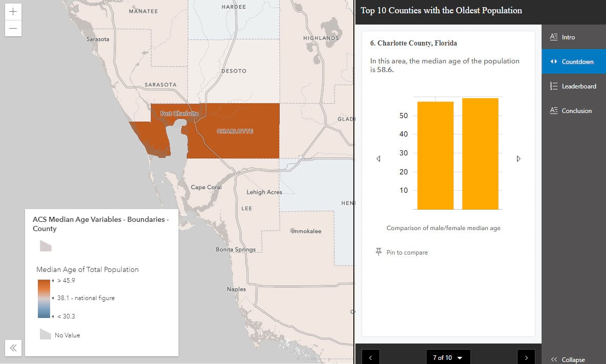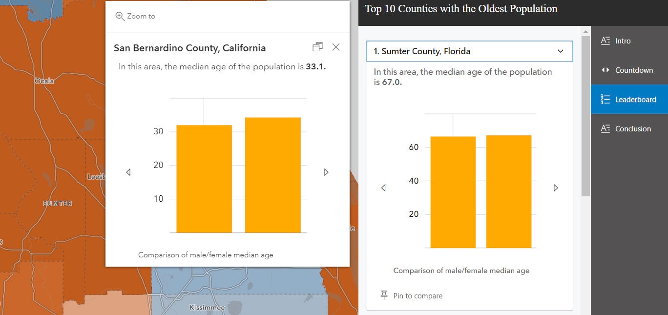 Accompanying the map-based countdown experience is an optional list-based Leaderboard section. The Pin to Compare button allows the app’s viewers to pin a particular feature to compare with others on the list. Up to two pop-ups can be docked for comparison. The leaderboard section does not need to have the same number of features as the countdown. In this example, the leaderboard has a list of the top 15 oldest counties, whereas the countdown goes through the top 10.