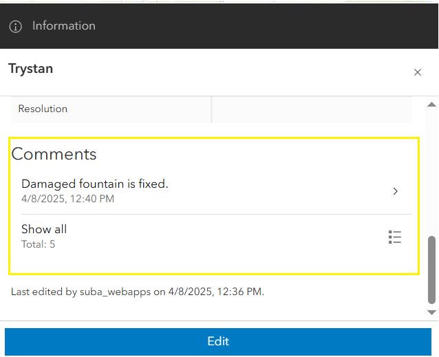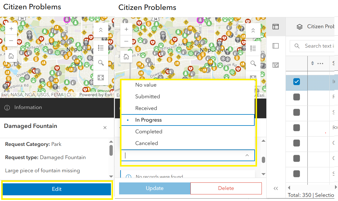 - To update the attributes, click the Edit button in the popup. For example, change the status of the repaired fountain from In Progress to Completed. Updates are reflected instantly in both the table and popup.