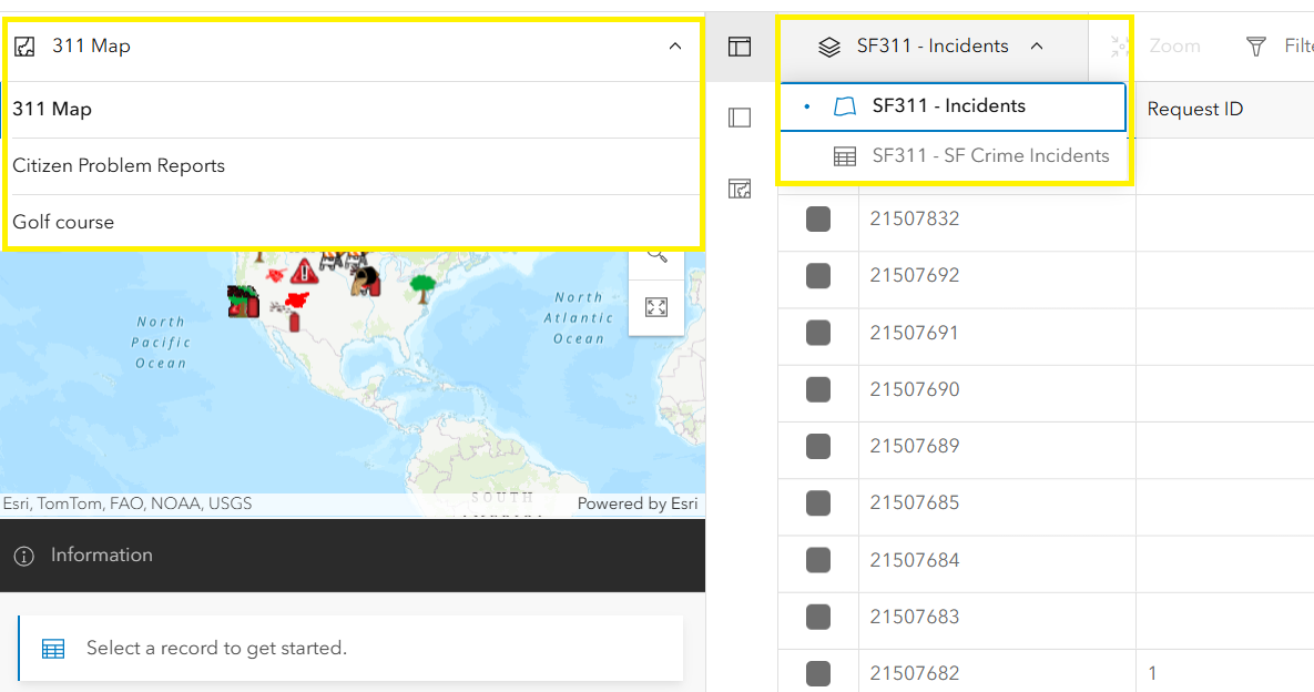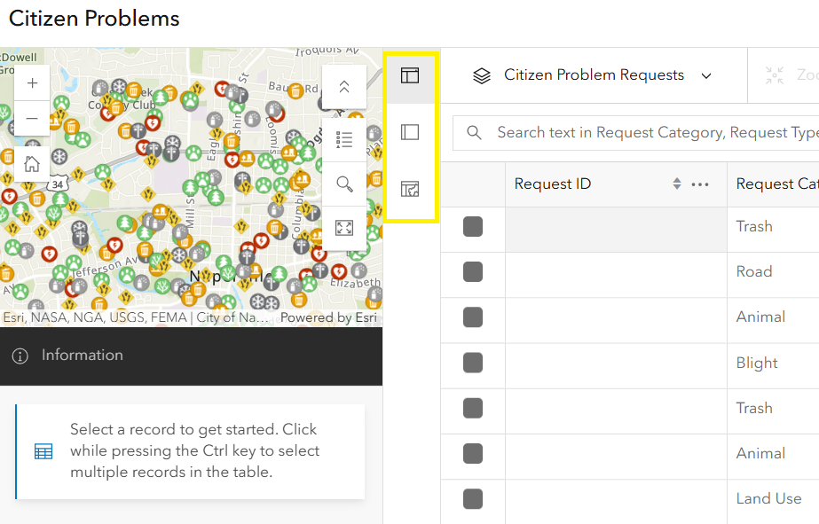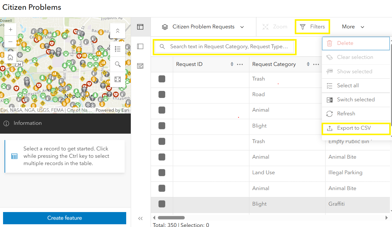 - Use the search bar to find records based on specific keywords or values, such as a request category. To leverage this functionality, the layer must support full-text search, which is configured on at least one string field. Follow Esri’s documentation under the section “Add a full-text index to string attribute fields” to learn how to set this up. Once configured, users will see a search textbox with placeholder text indicating the searchable field used to filter through the reports