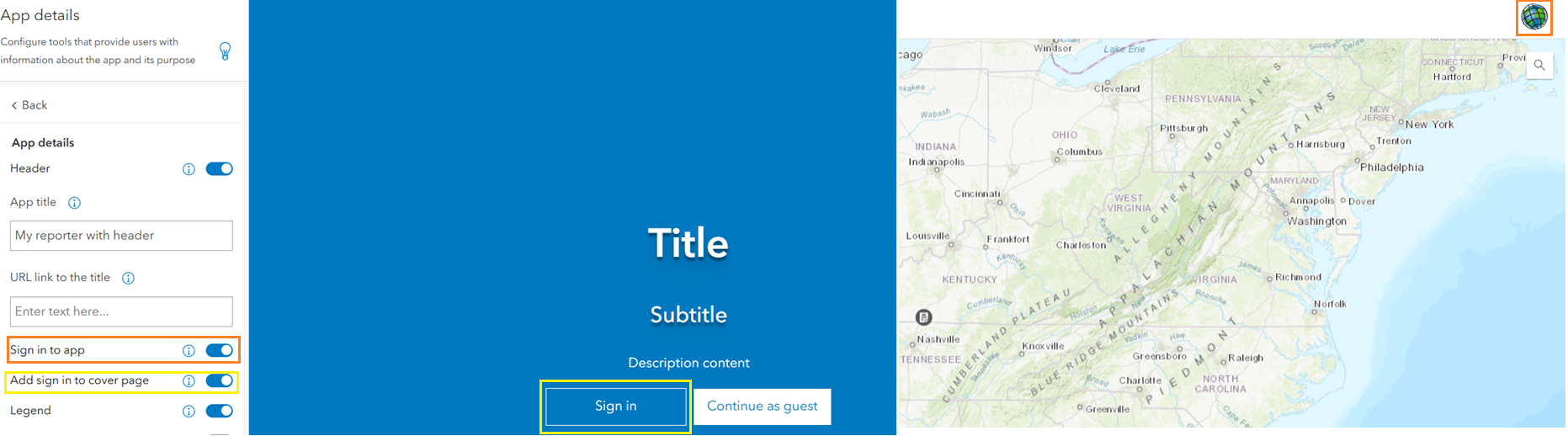 When this option is toggled off, it removes the Sign in button from the top-right corner of the app. As part of this update, the Enable Sign in setting that previously appeared in the Cover Page section has been moved to the About tab. A new toggle parameter, Add sign in to cover page, has been introduced. This toggle is off by default, and app authors must enable the Cover Page to display the Sign in option there.