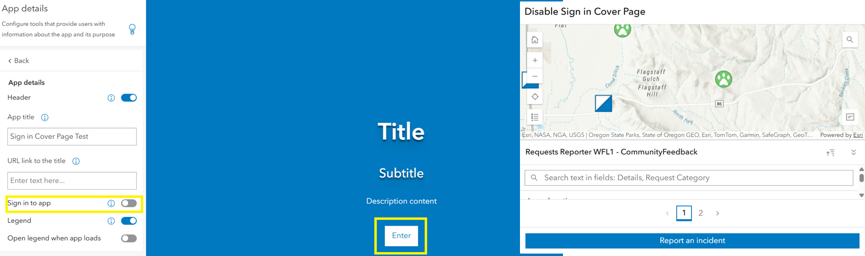 If the Add sign-in to cover page toggle is turned off, the cover page will display only the Enter button (configurable text). For apps configured prior to this release, the Sign in and Guest options will no longer appear. Users can access the app by selecting Enter.
