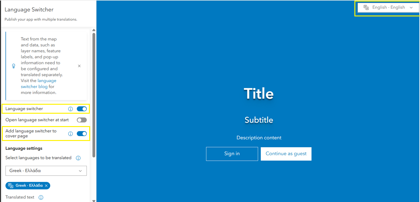 To configure this, first enable the Language switcher in the configuration panel. Once enabled, you’ll see additional options available in the Language Switcher tab, such as Add language switcher to cover page. If this option is not configured, users can still access the Language Switcher within the app after it loads.