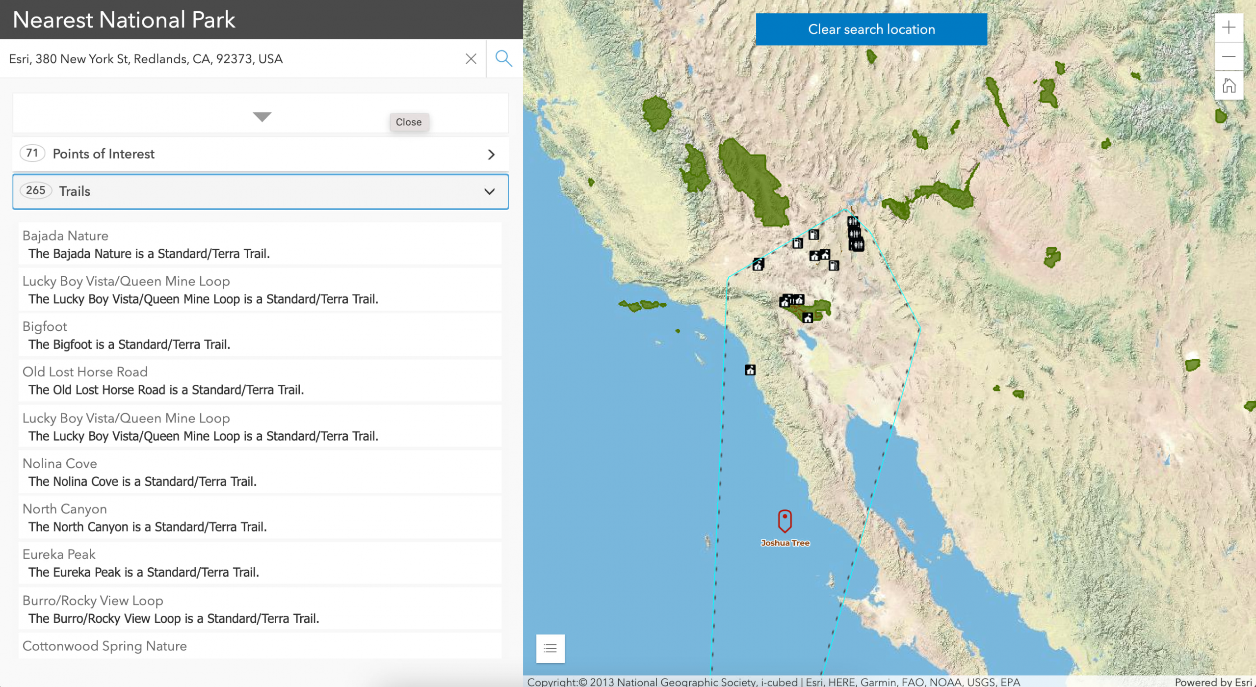 In simpler terms, when an address is searched the polygon with the closest National Park is identified and lists of points of interests and trails located in the identified National Park are displayed!