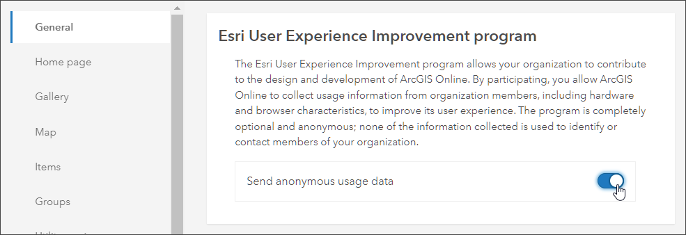 Scroll down to the Esri User Experience Improvement program section and toggle Send anonymous usage data.